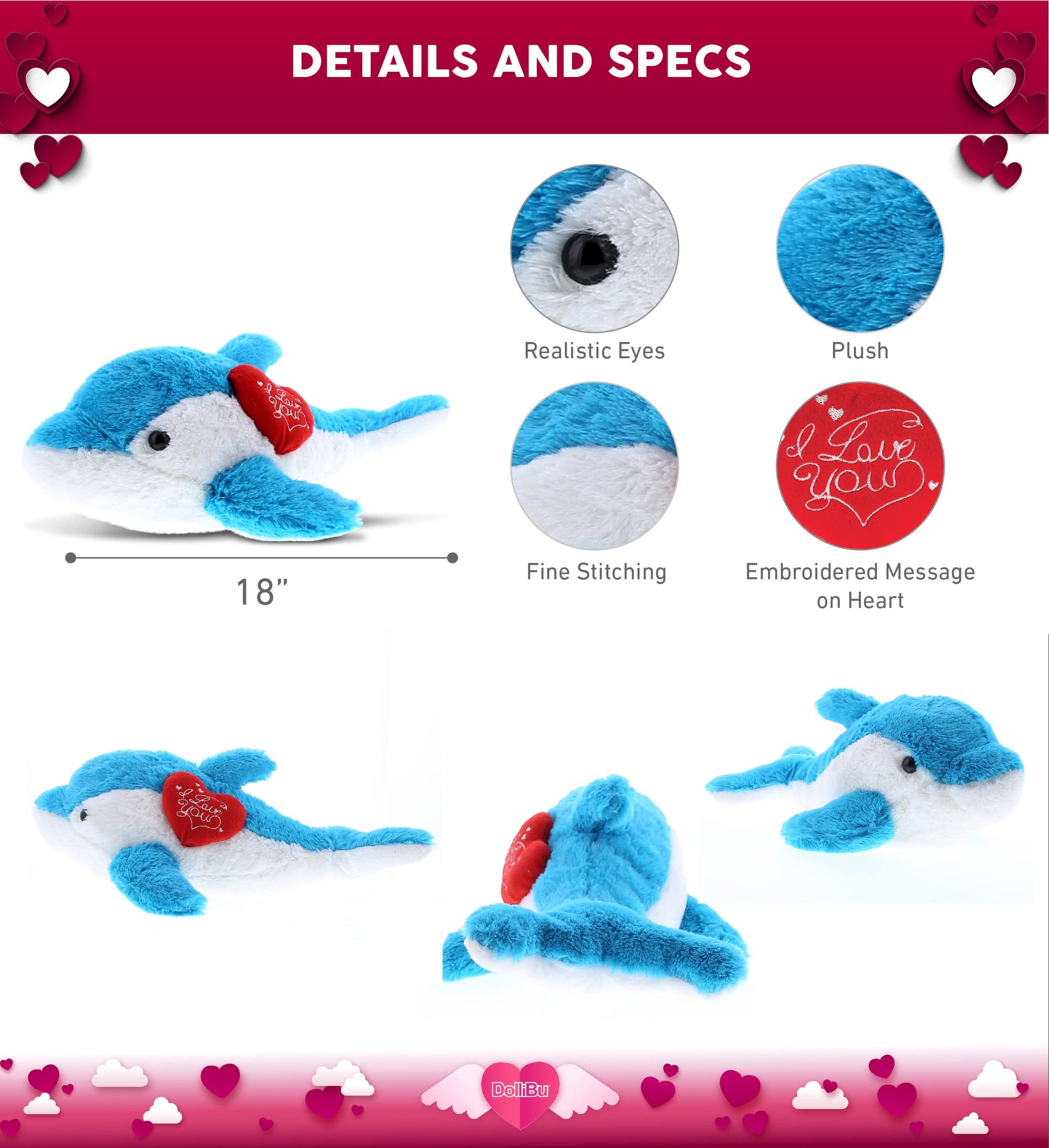 - INCLUDED WITH THE PURCHASE – Includes 1 DolliBu Marine Blue Dolphin stuffed toy measuring about 18Lx7.3Wx5.7H inches with a romantic message. The Marine Blue Dolphin plush ocean life comes with a red stuffed heart attached featuring a beautifully embroidered 'I Love You' message. Then for an additional cost, you have the option to add, Gift Bag, Tissue Paper, Greeting Card, and Personalize with a name.
